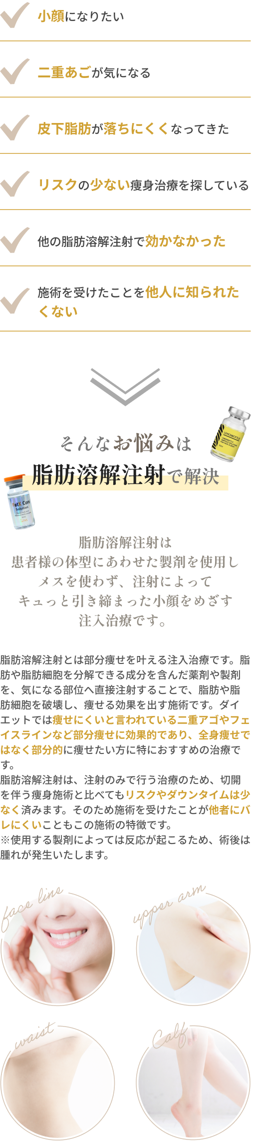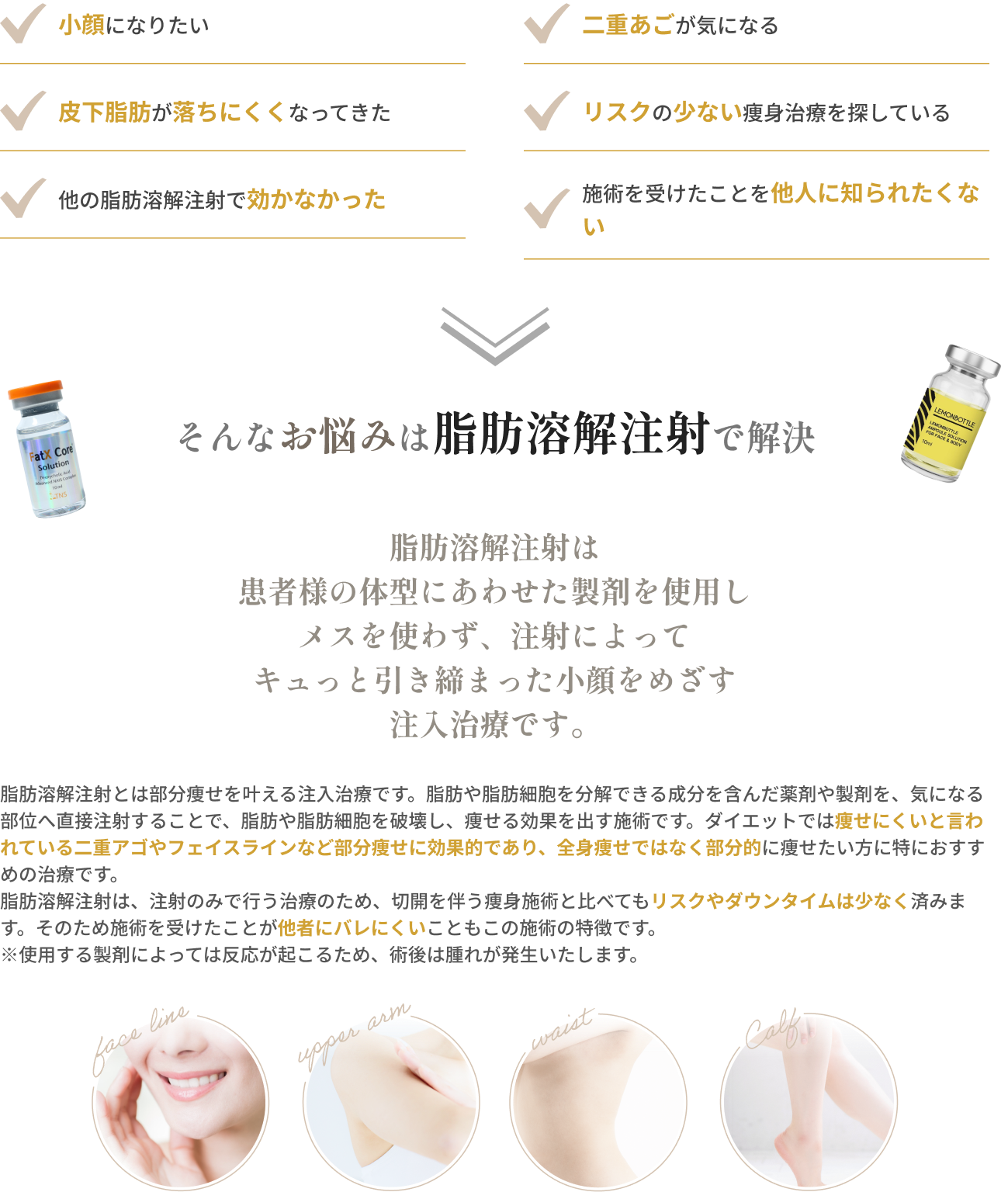 - A.脂肪溶解注射は気になる箇所に薬剤を注入し、脂肪組織にある脂肪や脂肪細胞を分解いたします。溶け出した脂肪は老廃物と一緒に自然排出されます。危険性はなく、安全なお薬ですのでご安心下さい。禁忌は下記をご確認ください。