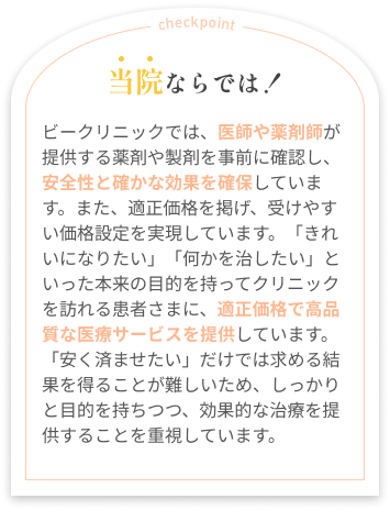 専任の薬剤師が薬やサプリメントの管理・選定をおこないます。保険診療だけではなく、美容皮膚科・美容外科で使用する薬剤に関しても成分や作用・副作用を考慮し、最新のエビデンスに基づいて提供いたします。スキンケアコスメに関しても、カウンセリングにて患者さまのお肌の状態をしっかり確認し、ベストな提案をさせていただきます。