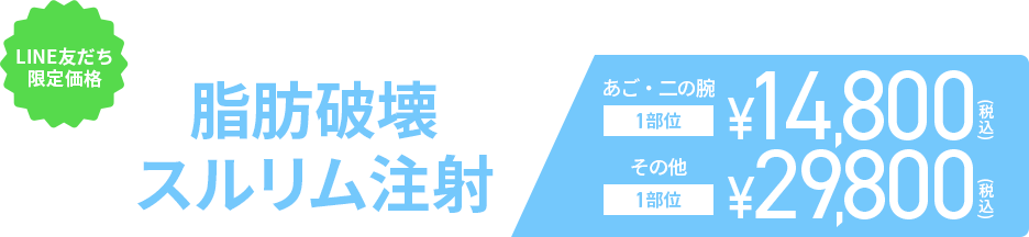 脂肪破壊スルリム注射の料金 | 1部位14,800円~ ※LINE友だち限定価格 |
