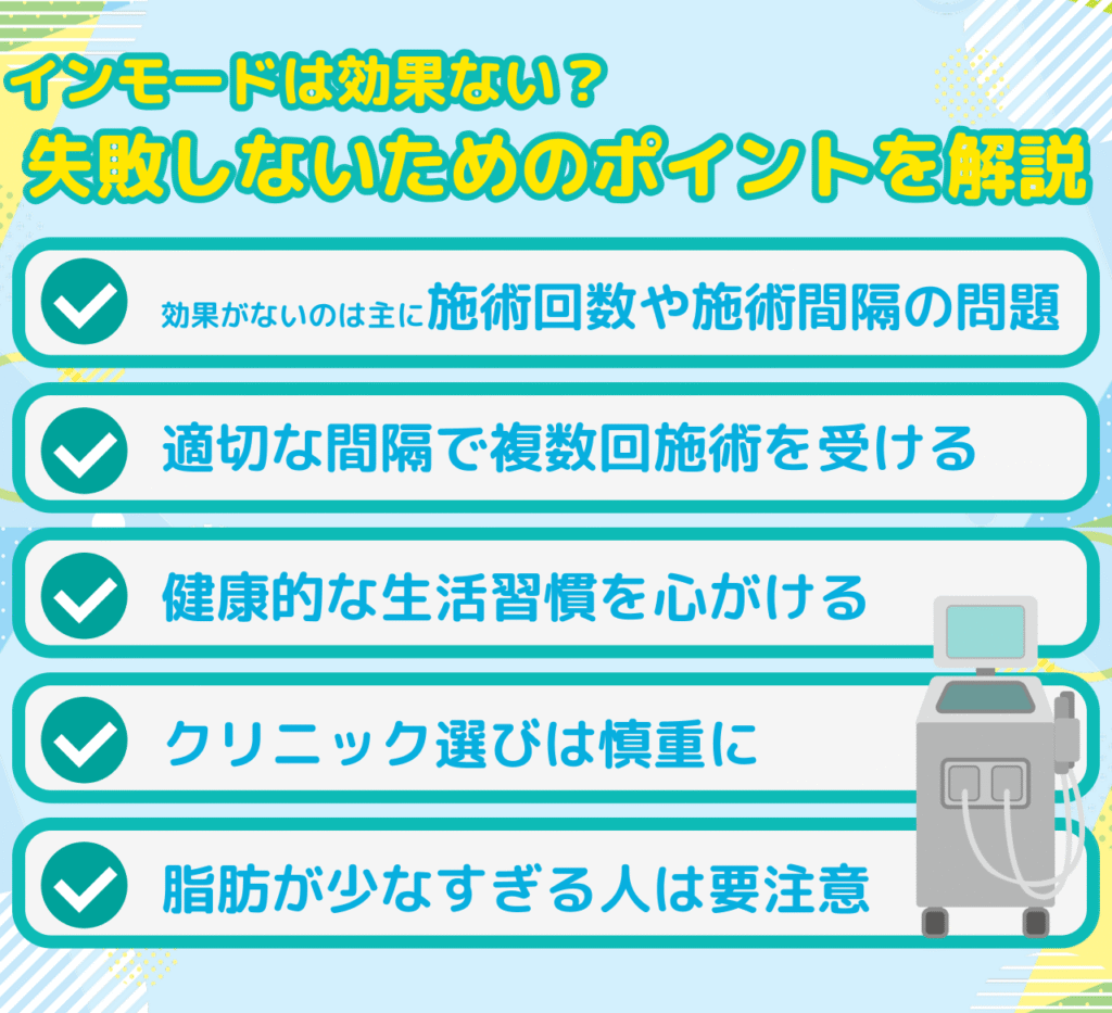 「インモードを受けたけど効果がなかった…」という声もありますが、その多くは施術回数や受け方に原因があります。
